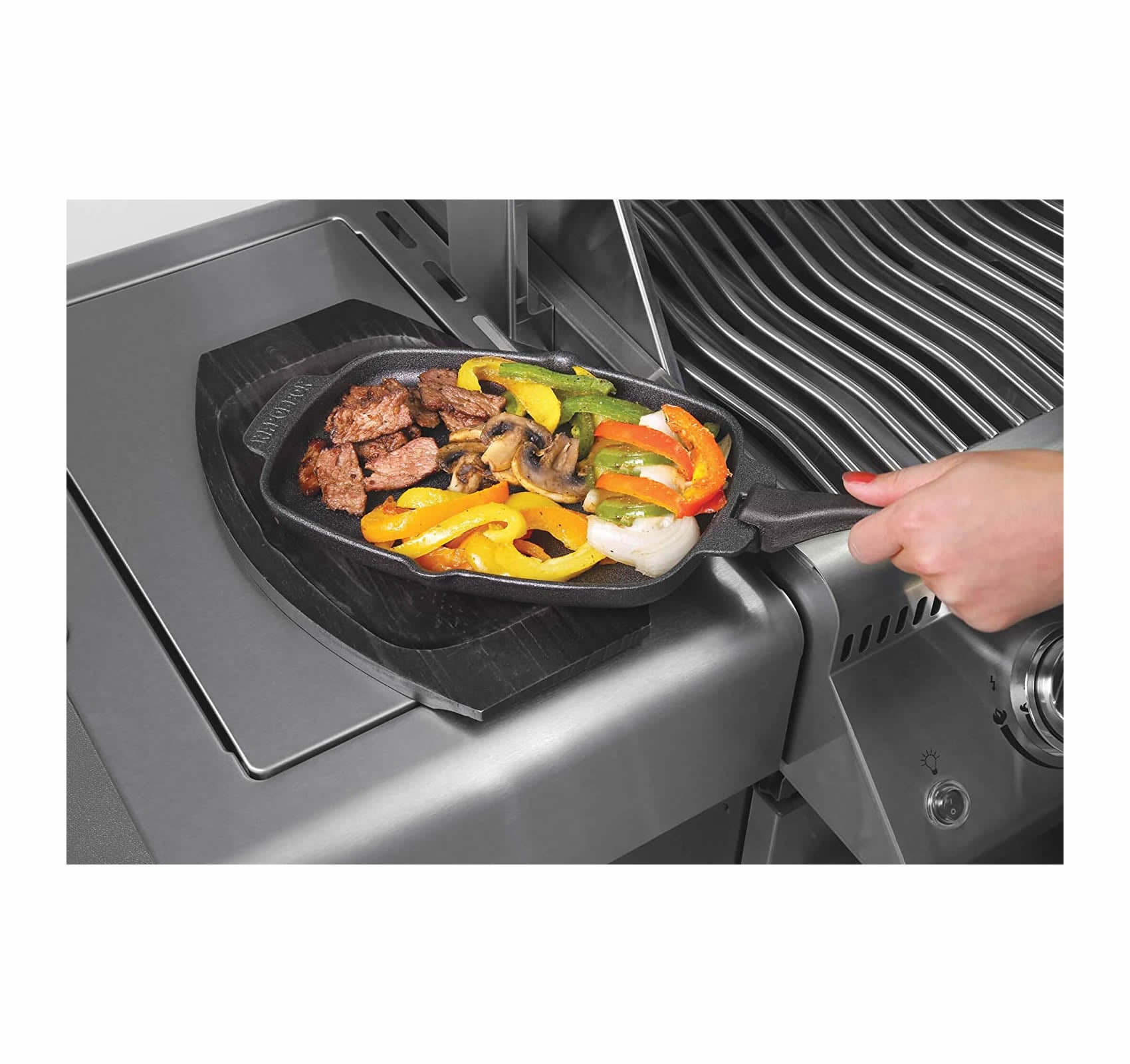 Napoleon's PRO Series Sizzle Platter With Wooden Server Set is a versatile meal prep machine. Creating the perfect fajitas just got easier. Made from durable cast iron, the more you use your Sizzle Platter, the better it will get. It's perfect for use on the grill, on the side burner, on charcoal, and even in your oven or on your stove. Serve directly from the hot grill to the table using the beautiful wooden serving tray. And the removable handle stays cool while you cook, easily sliding into the slot, then coming out again when you need it to. Imagine all of the ideas you can cook up with your PRO Series Sizzle Platter with Wooden Server Set. What's In The Box: Each Sizzle Platter set comes with its own custom fit wooden server for the deep cast iron platter, and an interlocking handle that is removable to stay cool while you're cooking on the grill or in the oven.