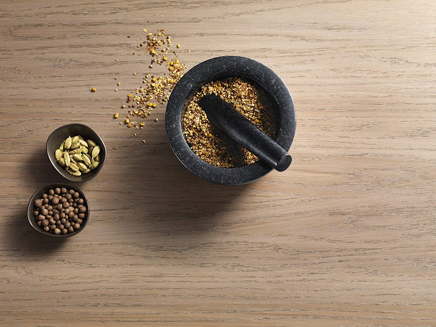 Con este mortero de alta calidad y su mano de mortero de ZWILLING, podrá moler fácilmente especias y hierbas de manera tradicional. Los morteros de granito aseguran solidez y calidad y su elegante diseño negro combina bien en cualquier cocina. El granito negro es sólido y pulido, sin porosidades, elaborado mediante un moderno proceso de fabricación y que permite lavarlo de forma sencilla e higiénica. Este mortero de ZWILLING es particularmente resistente y asegura mantener el aroma de las hierbas, especias y semillas.